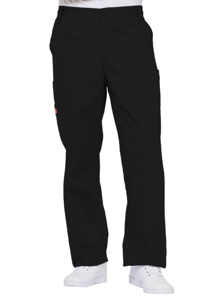Men's zip fly pull-on pant features an all around elastic waistband with a button closure, an adjustable interior drawstring and Dickies logo twill tape on the inside back waistband. Also featured are slash pockets, cargo pockets and a back pocket with a Velcro® closure for security, a D-ring on right front belt loop and double needle topstitching throughout. Regular inseam: 31½". Tall inseam: 34½".