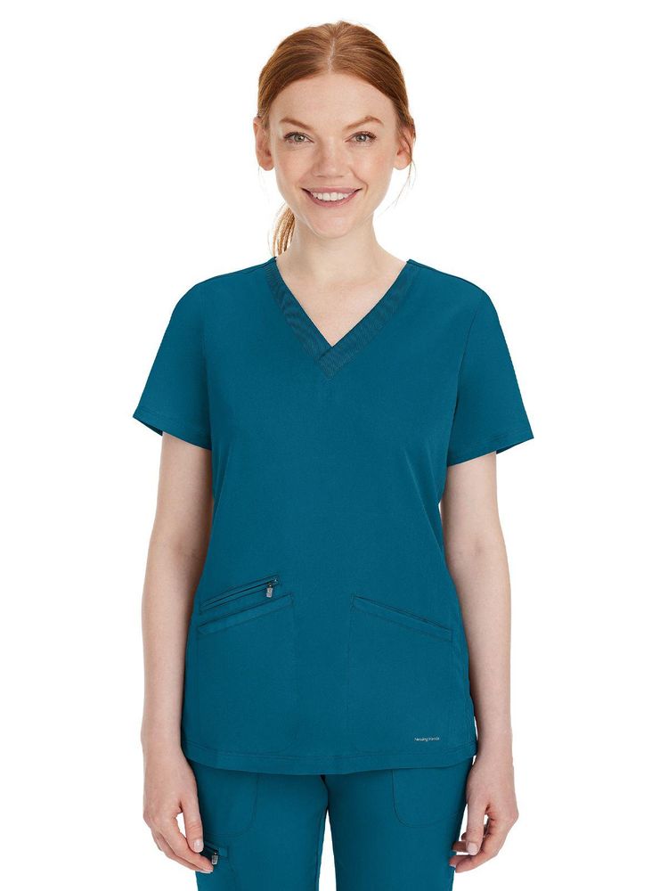 Modern fit, women's Rib V-Neck Top. 2x2 rib knit at the neckline and on side panels. 3 pockets, including 2 welt pockets and 1 zipper pocket. Other features include knit cuffs and 4-Way Stretch fabric. Center back length: 26.5"